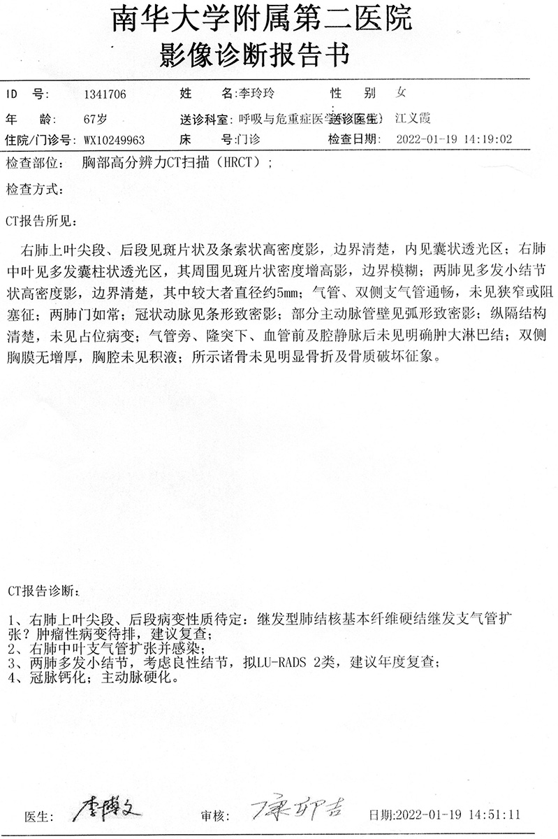 2022-01-19 南华附二胸部CT,LU-RADS 2类